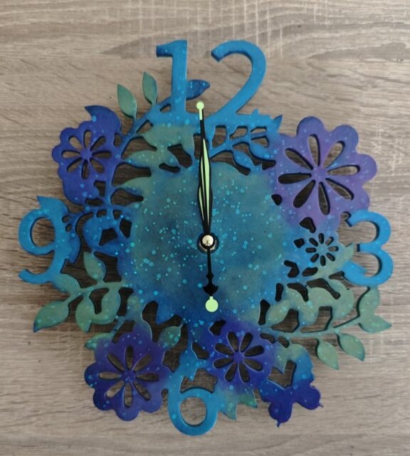 I'm delighted with my new mantel clock in shades of blues and purples. It sits on a display shelf in my study and is the perfect size. Thank you for creating such a stunning piece.