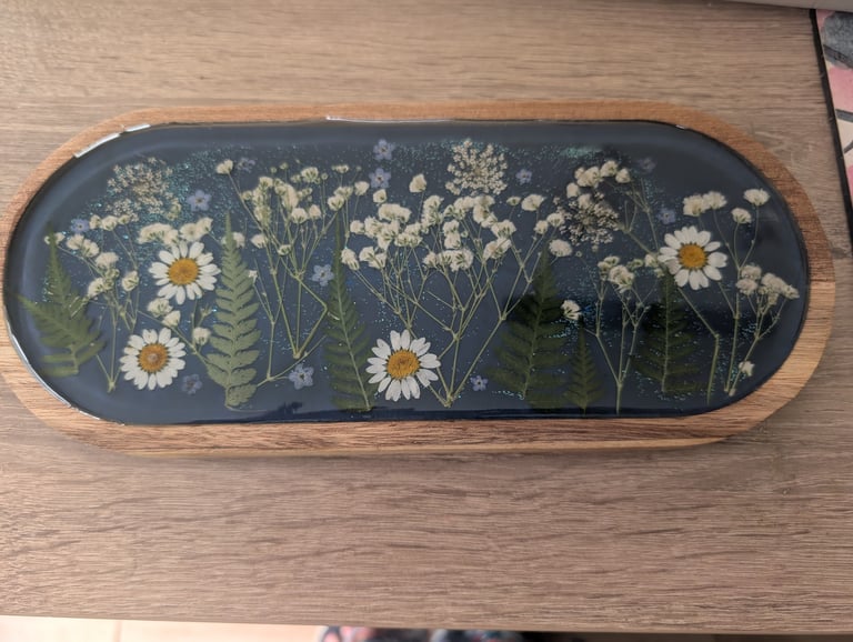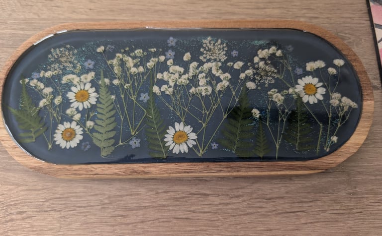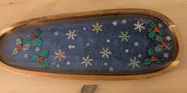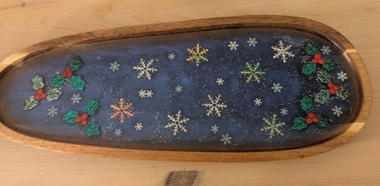 I was gifted one of your Christmas themed trays in deep blues with tiny inset snowflakes and a touch of sparkle. I chose to display it as a centrepiece of my festive table with a few nightlights and it looked absolutely beautiful. A quality piece and all handmade, thank you! Carolyn T.